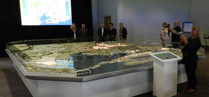Cardiff Bay Marketing Model 1:1000 scale masterplan model. Built to illustrate the proposed scale of several major development areas in a prime waterside location, this model used illumination to highlight the key sites in the project. Each of 11 different plots can be illuminated individually at the touch of a button. Even at 1:1000 scale, this model is 6 metres long by 5 metres wide and had to be built in 8 sections so that it could be transported and set up at different locations. It is a smaller, mobile version of the model shown on the 1:750 Models page.