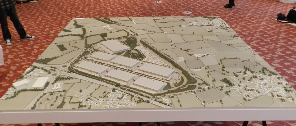 Model for Public Consultation 1:1250 scale landscape model. This 2.5m x 2.5m model was commissioned as part of a public consultation process for a proposed development just off the M1. Comprising 6 A0 sized sections, the purpose of the model was to demonstrate how high embankments and landscaping around the site would screen it from surrounding villages. For this reason it was important that the proposed on-site levels and surrounding topography were all accurately recreated. The buildings are only shown as massing blocks due to the small scale (1:1250).