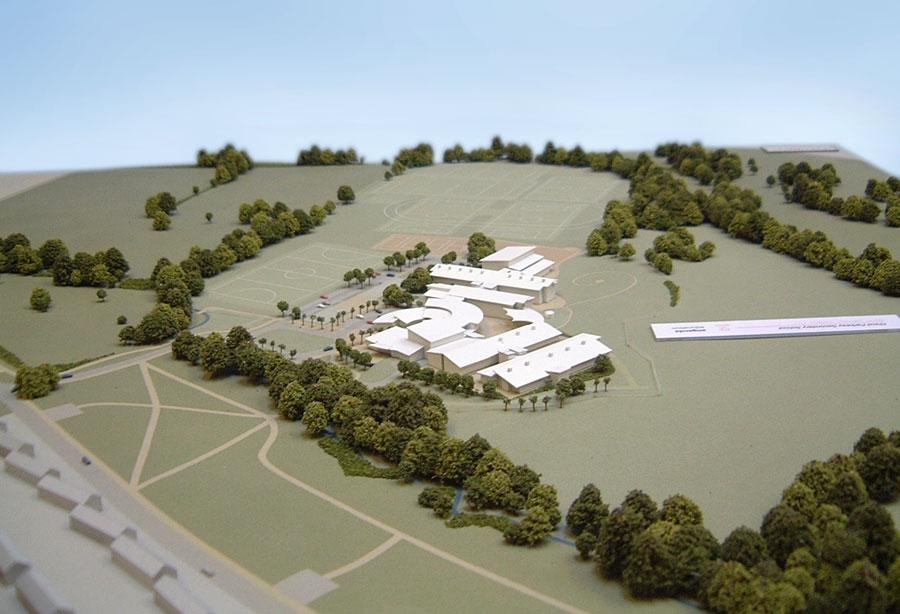 Our expert model makers can create bespoke masterplan models and topographical landscape models to depict very large areas. These models typically use a 1:1000 scale, meaning that each real-life metre is represented by 1mm on the model.Because of this, the amount of detail that can be shown on the model is fairly limited, with simplified massing blocks to represent buildings. That said, we have created some very intricate masterplan models using the 1:1000 scale – including a model of a school that included clear acrylic windows (see 'Detailed White School Model' below).