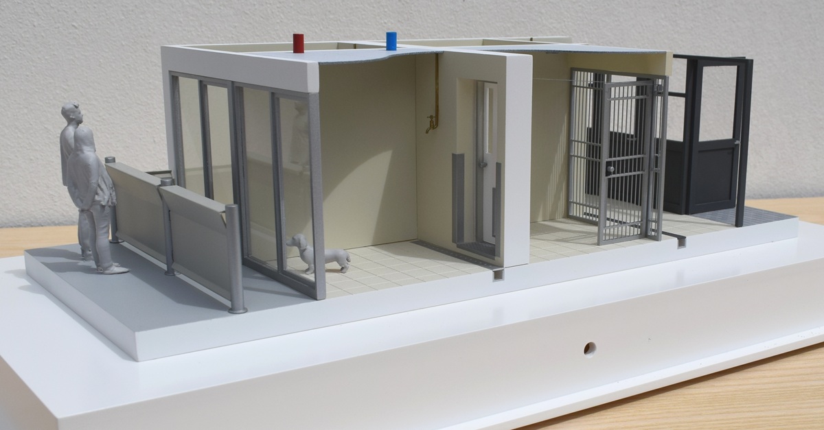 Dogs Trust Kennel Model – 1:25 scale We were commissioned by the Dogs Trust charity to produce a compact, portable model showing sectional views through their latest kennel design. The model needed to be detailed enough to illustrate the high-quality features of the design but small enough to be easily transportable. At 1:25 scale the model was less than 500mm long and was supplied with a sturdy, waterproof travel case.