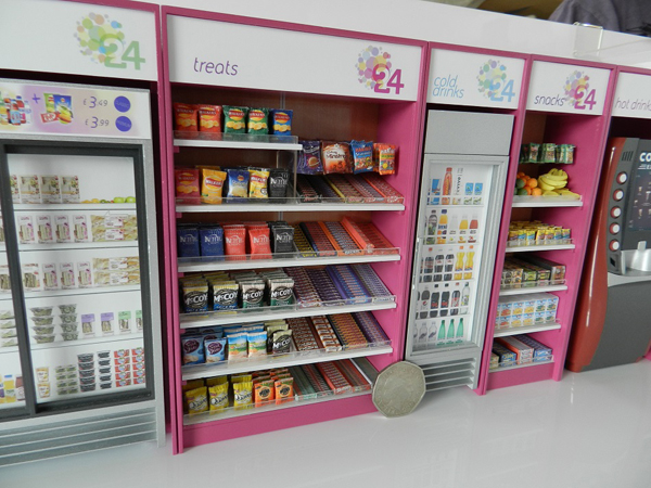 1:15 Scale Model for "Micromart" Demonstration This very detailed model (actually a set of separate models) was commissioned as a demonstration tool that could be safely transported and easily set up in potential customer's premises. With portability in mind we designed the model as a set of individual units that could be packed into a specially tailored travel case. The units are only 140mm tall but are made with realistic detail so that their function is instantly recognisable. To complete the picture we also created a "flat-pack" room setting made from white acrylic panels.