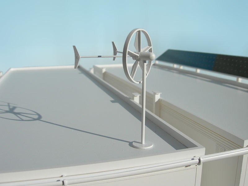 1:25 Scale Portacabin Site Office At 1:25 scale, this was quite a large and detailed model of what, on the face of it, is an uninspiring subject. However the model was actually commissioned to illustrate a proposed "environmentally friendly" site office featuring solar panels, rainwater collection, and a wind turbine.