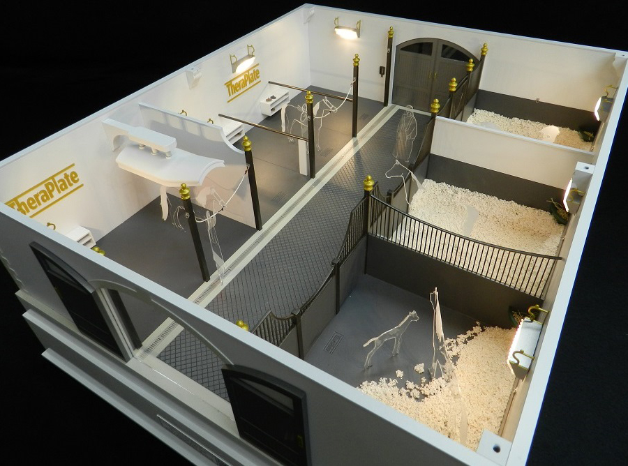 Stables model – 1:25 Scale The client for this project wanted an eye catching model they could use as a promotional tool at an event in Saudi Arabia. They wanted to showcase their product, a vibrating floor system, in a typical high end stables setting and asked us if we could come up with a design. As a starting point they gave us a hand drawn floor plan for the stables and we took it from there. We developed this fully realised 3d representation including battery powered lights to bring the model to life. We also provided a sturdy travel case with customised foam inserts to protect the model in transit.