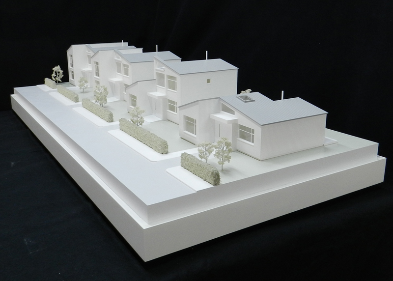 1:50 Scale White Styled Street Scene At 1:50 scale you can see through the windows into the room spaces of these stylized house models and get a sense of the spacial organisation inside the buildings. This model demonstrated the simple but elegant functionality of these proposed new house designs. The model was well received at the Ideal Homes show and we were subsequently asked to extend the "street scene" with two further houses from the luxury end of the range.