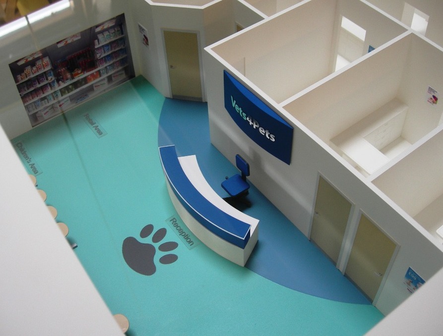 1:25 Scale Vets Practice The client for this project, a chain of vets, wanted a portable model that showed the typical internal layout of one of their newly built practices. We suggested this 1:25 scale stylized model because it offered plenty of recognizable internal detail but was easily transportable at only 800mm long. Rather than have a removable roof, we made the roof panels out of clear acrylic to allow easy viewing of the internal detail (this also keeps the dust out). Whilst it is predominantly a white stylized model, we added highlights of realistic colour to add extra visual interest.