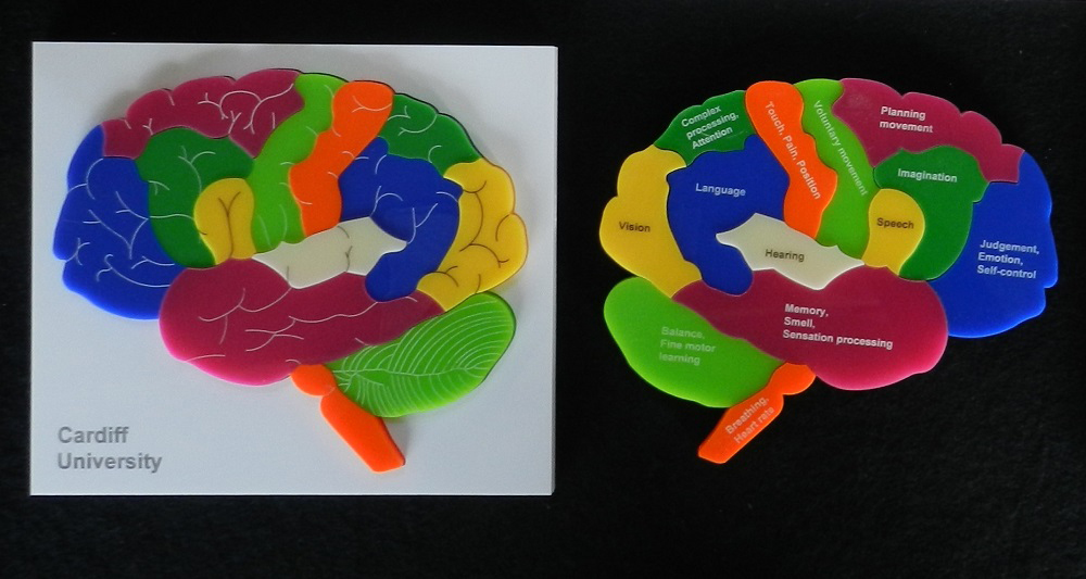Laser-cut Brain Puzzle – 1:1 scale These multi-coloured 2D puzzles are part of a set of six commissioned to help teach young students about different parts of the brain. They wanted a puzzle based on an existing, brightly coloured 2D diagram so we suggested creating the sections from layers of different coloured 5mm thick acrylic. This meant the pieces were self-coloured all the way through, rather than having a painted or printed finish which could chip, and we were able to to laser-engrave thin vein lines on the front faces and labels on the backs. We also laser-cut the profiled trays from two layers of white acrylic and created small cardboard folders to protect the puzzles when not in use.