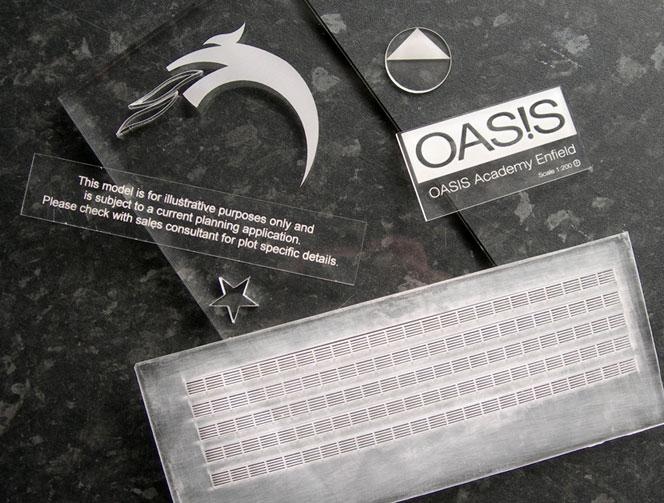 Cut & Engraved Acrylic These various samples illustrate the different effects the laser cutter can produce with clear acrylic. Crisp lines, frosted finishes, and intricately cut detail can all be combined to create interesting and attractive objects.