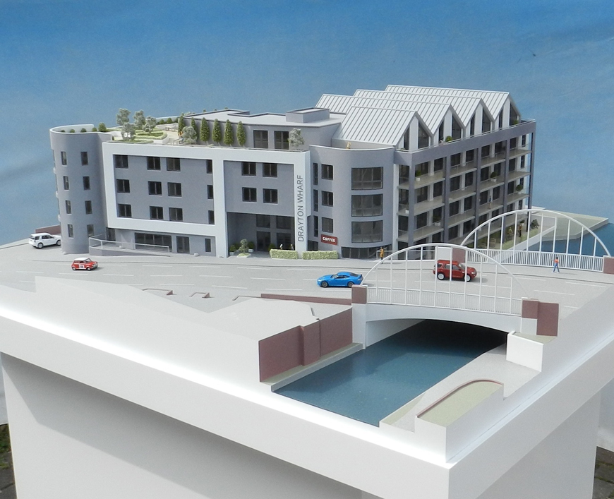 Canal-Side Apartments One of the important requirements for this model was to illustrate the extensively landscaped roof gardens which you can just make out in the photo. The client also wanted to show the multi-tiered stacking car park spaces at the rear of the buildings as the extra parking was a big selling feature. This model also incorporated LED lighting which you can see if you click on the "Illuminated" section above.