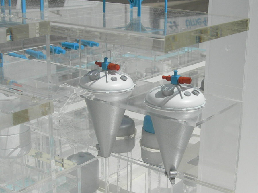 Pharmaceutics Factory Model GlaxoSmithKline needed a simplified representation of this facility to help illustrate the processes involved in Penicillin production. Our solution was this stylized 3D representation of the building with floor plates in clear acrylic, allowing the viewer to appreciate, at a glance, the vertical and horizontal layout of all the major industrial components involved in the process. Creating the model involved deciphering and rationalizing a huge volume of technical drawings so that we could design a pared down representation of the main production equipment. A crucial part of this process was keeping an ongoing dialogue with the client to make sure we were interpreting the information correctly. At just over 2.4 metres long, the model can be easily viewed by a group of people, making it an ideal starting point for a tour of the building.