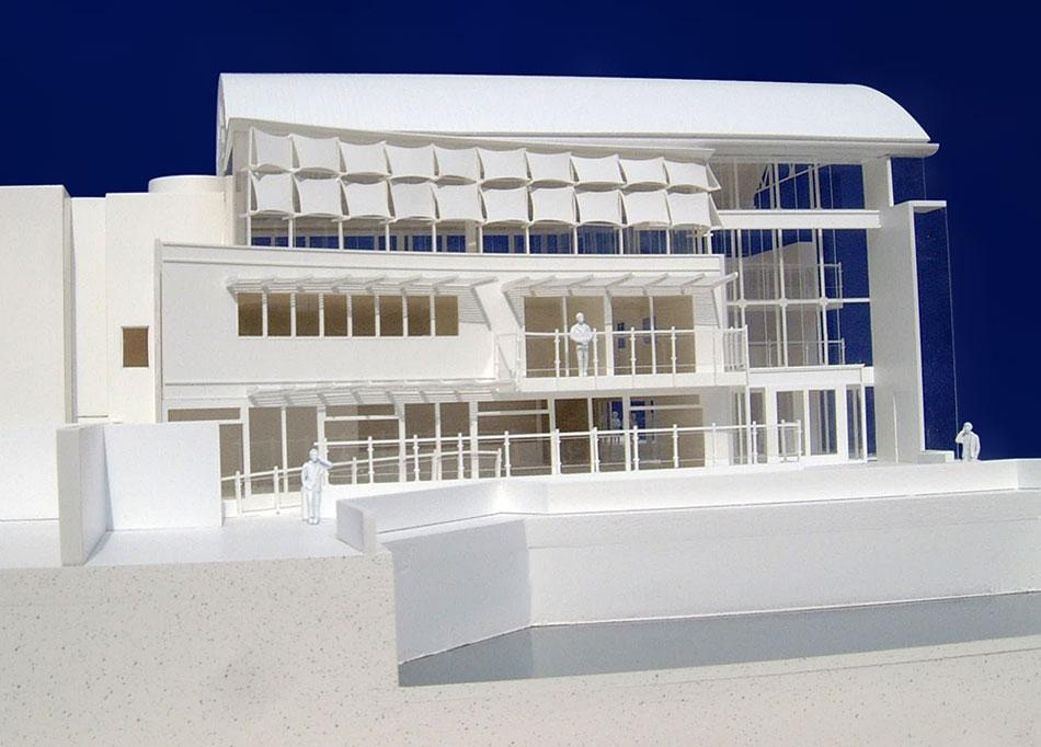 White Cut-away Model An all white, part model built to illustrate the internal and external spatial arrangement for an extended café facility on a former industrial building.