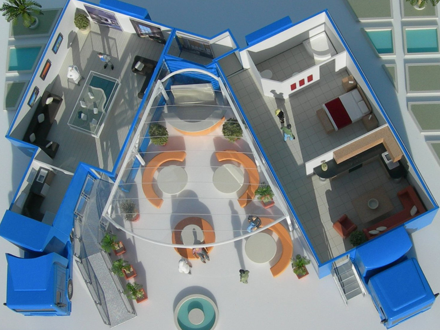 Mobile Exhibition Venue With the aim of marketing his mobile exhibition venues abroad, the client needed a compact model he could take on the plane rather than entrusting it to the baggage handlers of the world's airports. This was our solution. From an initial concept sketch, we designed and built the model in just 6 working days, incorporating removable roofs, interchangeable floor layouts and a Perspex cover. The whole thing measured just 350 x 290mm and fitted into a small padded suitcase that complied with on-flight hand luggage restrictions.