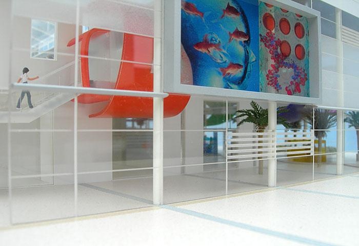 Part Section of School A sectional model designed to demonstrate the double height communal spaces within a proposed new school. The client also wanted to show the brightly coloured internal design elements as well as the vivid images planned for the external elevations.
