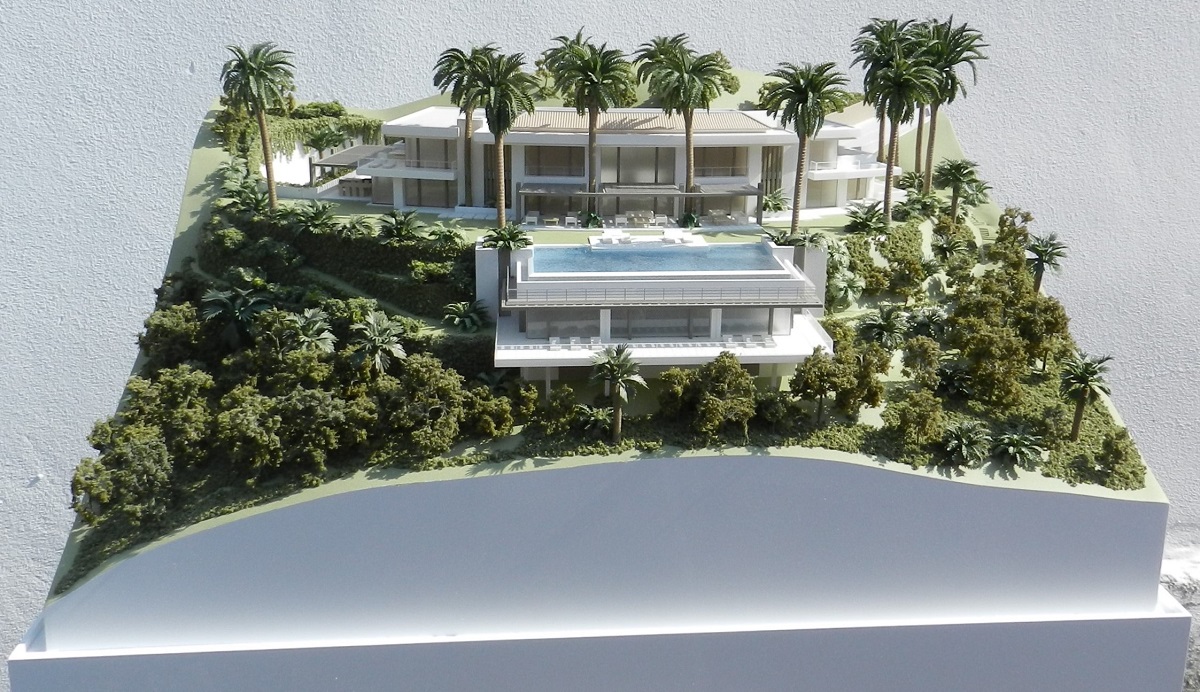 Spanish Villa Model Located on a steeply sloping site (as you can see from the photos) this was a model where the topography was almost as challenging as the building itself. Designed over three levels, interlinked by steps and ramped walkways, the villa was an integral part of the surrounding landscape and the two elements had to be modelled very accurately to fit perfectly together. The client actually asked us to produce two identical models, one to be kept in the UK and the other to be shipped to the architect in Spain.