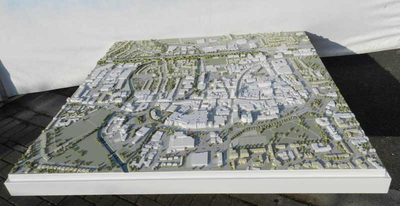 Maidenhead Masterplan Model 1:750 scale was perfect for this project because it allowed us to show a large area (a town centre) on a reasonably compact base but at the same time the buildings are large enough to appreciate storey heights and general massing. This model is 1.8m square and includes over 20 removable panels for the redevelopment zones which allows interchanging of different options so that each proposal can be viewed and assessed within the overall 3D context.