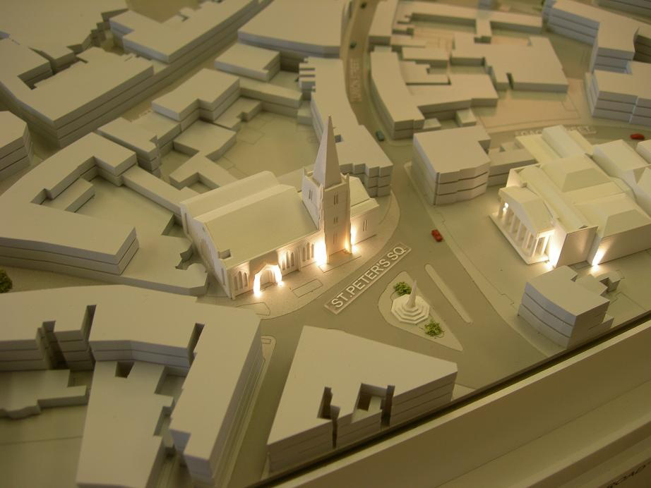 Redevelopment Area Planning Model This model was used to evaluate different proposals for a city centre redevelopment area. We built the context model and supplied templates so that each developer could create a drop-in panel that would fit into the main model. The model had various lighting features including a button that demonstrated the path of a famous FA Cup goal at the local stadium, complete with original commentary from a hidden speaker.