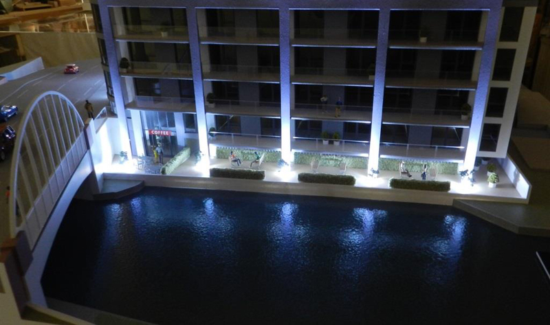 Canal Side Apartments The lighting effects on this model were a late addition to the spec when the client decided they wanted to add some extra visual impact to this, one of their main marketing tools for these apartments. Even though model was more or less finished we were able to retro-fit strategically placed LED up-lighters along the main elevations and to illuminate the undercroft parking. You can see the full model on the "1:100 Scale" pages.