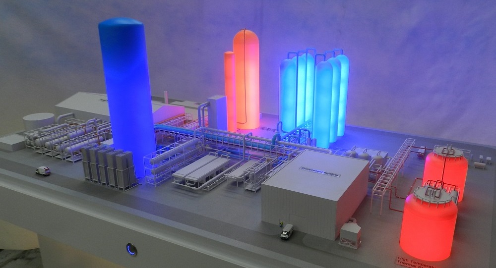 CryoBattery Power Station – 1:150 scale Although this is very much a stylised representation of a CryoBattery power station the main purpose of the model was to illustrate the operating processes of the system which uses renewable sources to compress air in tanks which can later be used to generate power. In effect, it acts as large battery to store energy for when it is most needed. To demonstrate this we've used interactive LED lighting effects combined with strong colours to indicate the different stages of the process. The LED illumination rises slowly upwards to the top of the vessels and then gradually drops down again to represent the "filling up" and "emptying" phases of the CryoBattery system. Visit the "Interactive Models" page to see a "lights on" view of this model. Architectural Models Exhibition Models Industrial Models and so much more... View our Gallery >