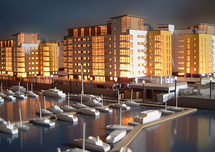 Dockside Apartments - Scale 1:200 This complex model featured six elevated apartment blocks enhanced by three independent lighting systems illuminating different aspects of the development, including an individual control for each building.