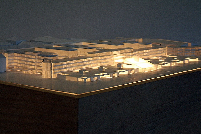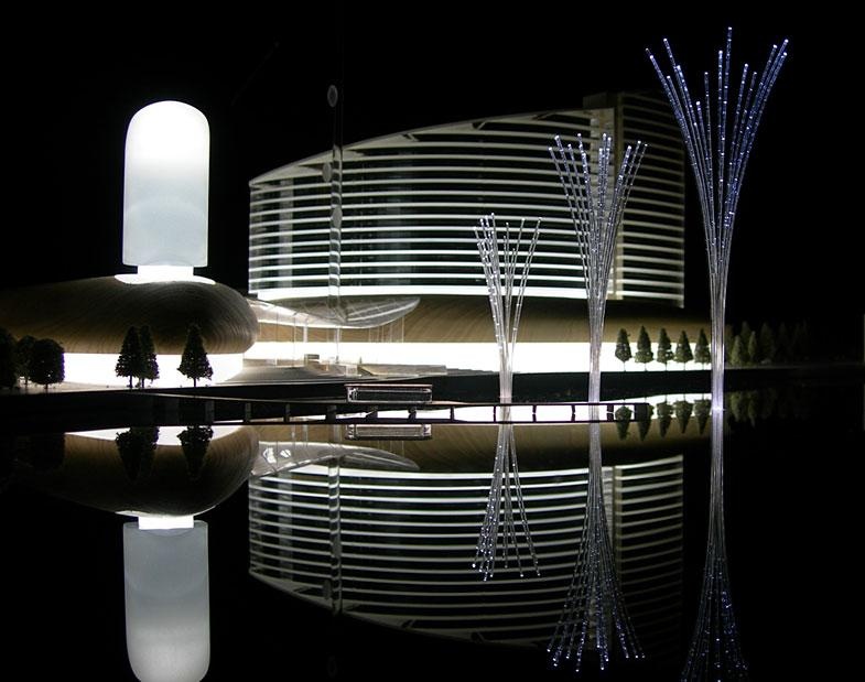 International Sports Village - Scale 1:500 A 1:500 scale site model for the proposed international sports village in Cardiff Bay. The client wanted to combine wood, Perspex, white surfaces and bright illumination in what is essentially a concept model with the theme "Snow, ice, fire, water".