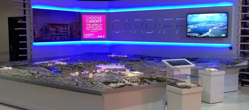 Interactive Model of Cardiff This 6.5m x 5.5m interactive model was designed for use in a permanent marketing suite to promote the city of Cardiff to national and international investors. It is a fully interactive model controlled via a large touchscreen which activates over 30 different lighting zones on the model and at the same time displays relevant information pages on the screen. The screen images are also projected onto a large screen so that the information is visible to all. The model was designed to be mobile and so far has been to three different venues including London and Cannes (these pics were taken in Cannes in 2014).