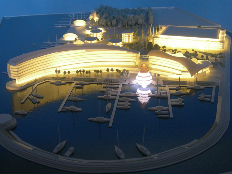 Saint Petersburg Marina – Scale 1:750 Incorporating battery powered white LEDs, all the buildings on this white styled masterplan model could be illuminated at the touch of a button. Another significant feature about this model is the high level of detail that can be achieved at this very small scale (all buildings are under 35mm tall). The model was built on a very tight schedule and shipped off to Russia (in a purpose-built flight box) to be used as the centrepiece of a major presentation.