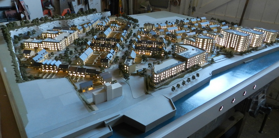 Waterside Housing Model – Scale 1:250 Commissioned for a Thames-side housing development in East London, at 2m x 1.4m this is a larger than usual model but the client had allowed plenty of space for it as a centrepiece of their marketing suite. The lighting effects include the option to light up four separate phases individually, controlled by the buttons visible on the front edge of the model.