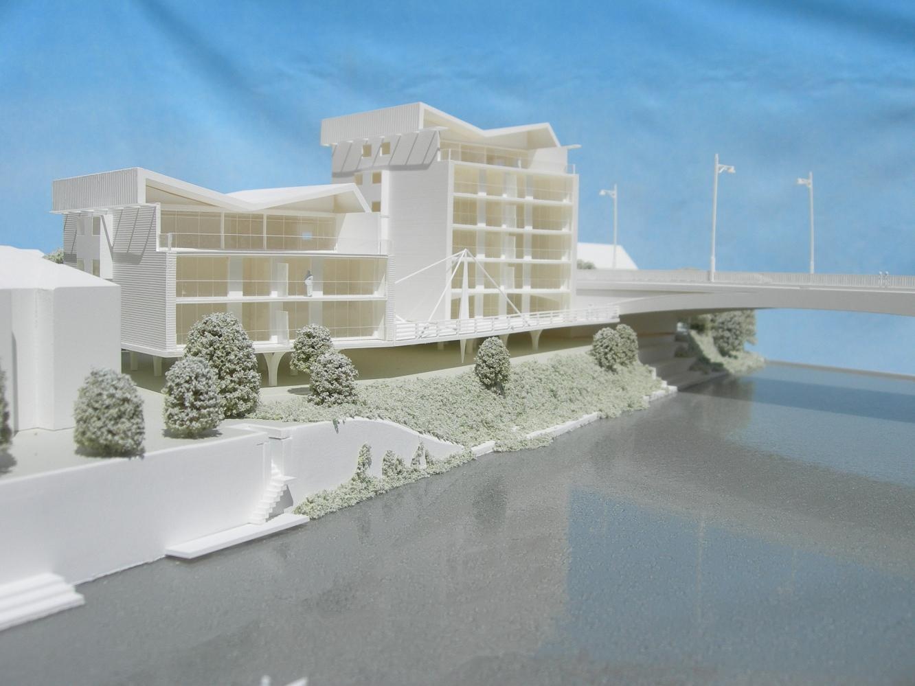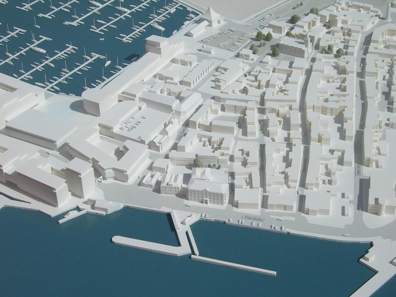 Block Model for Proposed Harbour Redevelopment – Scale 1.750 This model demonstrates how three different levels of detail can be combined to create an informative, attractive but not overly expensive block model. The ordinary off-site context buildings are made with very simplified flat roofs; the landmark off-site buildings are made to a very detailed recognizable level with windows and accurate roof pitches, while the proposed new buildings (which are still only a concept design) are made to crisply detailed level.
