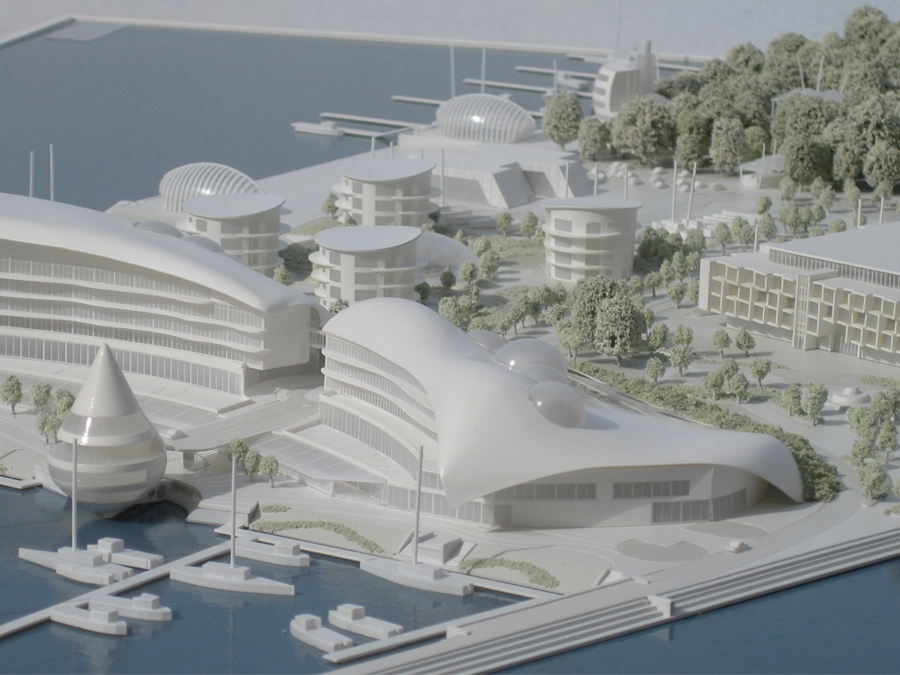 International Sports Village - Scale 1:500 A white stylized, 1:500 scale site model for the proposed international sports village in Cardiff Bay. The client wanted to combine wood, Perspex, white surfaces and bright illumination in what is essentially a concept model with the theme "Snow, ice, fire, water". Architectural Models Exhibition Models Industrial Models and so much more... View our Gallery >